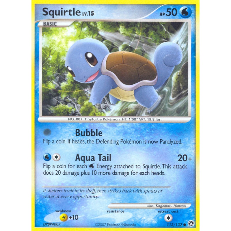 It shelters itself in its shell, then strikes back with spouts of water at every opportunity.Squirtle from the Secret Wonders set. This card features Bubble attack.Card Release Date:2007.Illustrator: Kagemaru HimenoConditionThis item is an official Pokemon